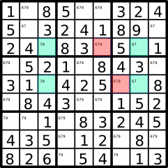 I eksemplet er to mulige plasseringer av tallet 7 i kolonne 3 og 8. Fordi disse stedene er parvis motsatt av hverandre, kan de andre mulige plasseringene av 7 fjernes fra rad 3 og 5.
